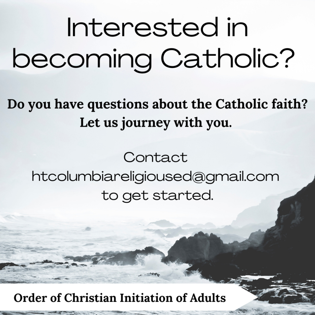 If you are curious about becoming Catholic, please contact Faith Murphy, Director of Religious Formation at htcolumbiareligioused@gmail.com for more information about our Christian Initiation process.